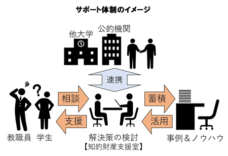 平成30年4月、本学内に「知的財産支援室」が新設されました。本学が行う教育・研究・地域貢献活動の様々な場面で知的財産に係る判断が求められることが多くなり、特に、地域貢献活動では、知的財産の取扱いについてより専門的な知見が必要とされます。