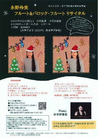 12月19日(月)、「永野伶実 フルート&バロック・フルート リサイタル」が開催されます。