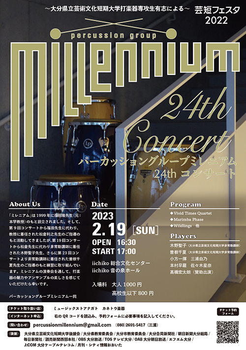 2023年2月19日(日)、iichiko総合文化センターiichiko音の泉ホールにて、本学音楽科打楽器専攻生による打楽器アンサンブルの演奏会「パーカッショングループミレニアム24thコンサート」を開催します!