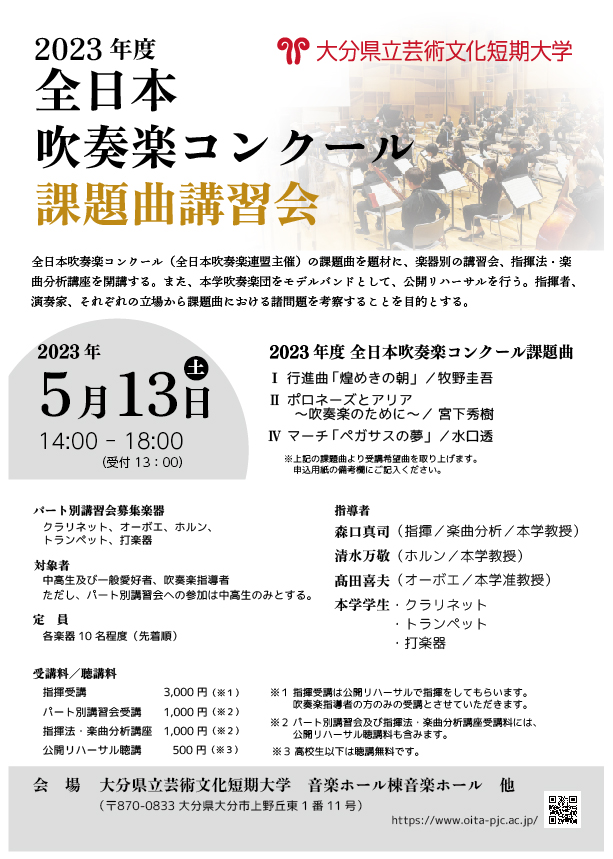 5月13日(土)に実施する「2023年度 全日本吹奏楽コンクール課題曲講習会」の受講者を募集します。