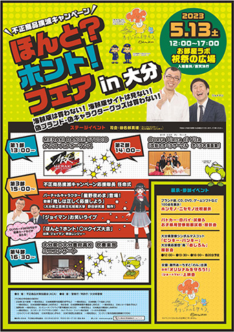 5月13日(土)に不正商品対策協議会が主催する「ほんと?ホント!フェア in 大分」が「お部屋ラボ 祝祭の広場」で開催され、情報コミュニケーション学科の野田研究室が出演します。