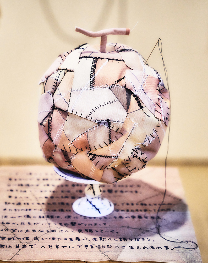 メロンは僕が子供の頃から大好物の果実でした。特に子供の頃はよく絵で描いていたことを覚えています。そんなメロンの網目模様には実は〝傷〟と深い関係があったのです。メロンの網目は実が大きく成長するときに全体に亀裂が入り、そこから果汁が出血のように溢れ出てきます。網目はそれを修復するための〝カサブタ〟です。成熟していく過程に残っていく傷痕が、人間も同じであると良いなと僕は思いました。メロンは網目がはっきりしてる程甘く育っていく。人間も心や身体に傷が残っているということは、人の痛みを知り優しくなれる。そんな人間的な成熟とメロンは同じなのかもしれないと。これまでずっと大好きだったメロンが〝傷〟というものを、温かくて力強いものへと変えてくれるように思いました。