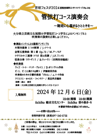 12月6日(金)、iichiko総合文化センターiichiko音の泉ホールにて、芸短音楽科コンサートシリーズNo.125「管弦打コース演奏会~師走に心温まるひとときを~」を開催します。ぜひ、足をお運びください。