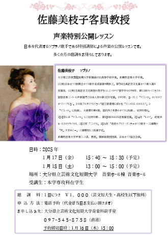 本学が誇る日本を代表するソプラノ歌手・佐藤美枝子客員教授による声楽のレッスンを2025年1月17日(金)、1月18日(土)に開催します。レッスンは聴講することができます。多くの方の聴講をお待ちしております。
