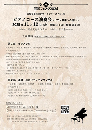 11月12日(水) iichiko音の泉ホールにて、芸短音楽科コンサートシリーズNo.128「ピアノコース演奏会~ピアノ音楽への誘い~」を開催します。ぜひ、足をお運びください。