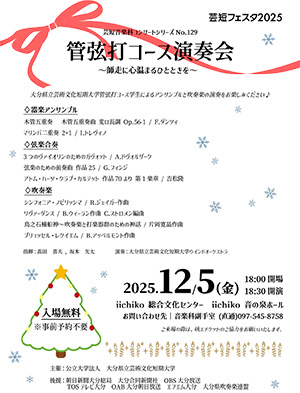 12月5日(金)、iichiko総合文化センターiichiko音の泉ホールにて、芸短音楽科コンサートシリーズNo.129「管弦打コース演奏会~師走に心温まるひとときを~」を開催します。ぜひ、足をお運びください。