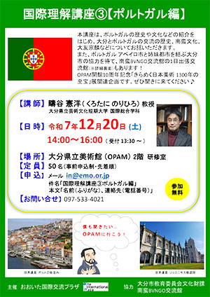 国際総合学科の疇谷憲洋教授が大分県立美術館(OPAM)で開催中の「きらめく日本美術1300年の至宝」展関連企画として国際理解講座③【ポルトガル語編】にて講演いたします。