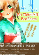 6月2日(日)の「第4回 府内学生エコフェスタ」は、天候不良のため、6月8日(土)に延期開催となりました。場所・タイムスケジュール等は変更ありません。6月5日まで開催予定であった写真展「若松通りVS府内五番街」は、引き続き継続開催中です。