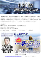 なお、同日、同会場にて自分戦略デザイン大学共同代表の新納昭秀氏による「あなたの夢をかなえる人生設計(Vol.1潜在能力編)」講座を開講します。今回は、受講者数1500人を超える人気プログラムを公開し、参加者の潜在能力を引き出します。
