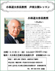 1月21日(水)、本学音楽棟 小ホールにて、本学音楽科 小林道夫客員教授による声楽公開レッスンを開催します。ただいま聴講者を募集中です。
