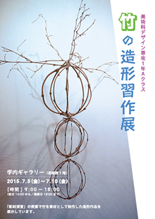 学内ギャラリー(芸術棟1階)では7月3日(金)~ 7月10日(金)、美術科デザイン専攻1年生Aクラスによる作品展「竹の造形習作展」を開催します。初日は14:00から、最終日は13:00までとなります。