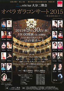 大分二期会の「オペラガラコンサート2015~新会員を迎えて~」が9月30日(水)、iichiko総合文化センター音の泉ホールで開かれます。本学から河添富士子(原谷)非常勤講師、上田雅美(中村)非常勤講師、愛甲久美准教授、行天祥晃(正恭)准教授のほか、専攻科の渡辺楓さん、田尻菜月さん、そして卒業生ら多数が出演予定です。ぜひ足をお運びください。