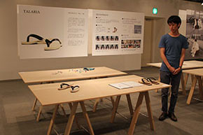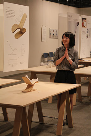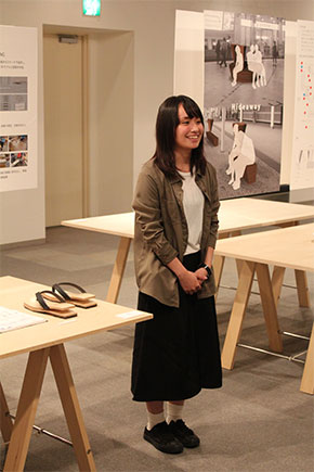 専攻科造形専攻プロダクトデザインコースの学生の作品が並ぶ「交差展 ~art exhibition8~」が9月3日(木)、iichiko総合文化センターの県民ギャラリー(B1)で始まりました。会場には様々な使い方ができるイスや段ボールを活用した照明、スプリング機能がある下駄や木製のクラッチバッグなどが展示されています。初日は観客の前で、各学生が自分の作品のプレゼンテーションを行いました。
