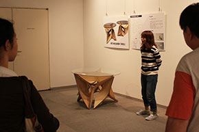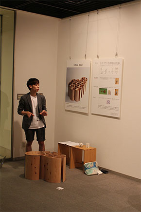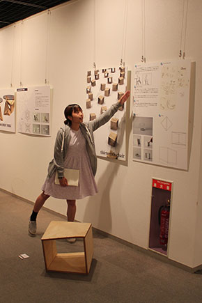 プリント類を簡単に整理し、必要なもの・不要なものを判別しやすくするための円柱ツール「Helical」を制作したリーダーの小林初実さん(2年)は「日常生活で机に書類がたまったり、郵便物やチラシが靴箱の上にたまったりするのが気になって思いつきました。簡単な所作で片付けられるように、円柱に紙を差し込むだけの仕組みです。中をらせん状にしているので、差し込んだ紙が微妙にずれ、たくさん入れても何の紙か見えます。必要なものと不要なものがすぐわかる、片付けをサポートするアイテムです」と、自身の作品を紹介しました。質疑応答では「もっと大きな形にすると公告設置などに使えるのでは」などの意見・感想も出ました。また、テレビ局や新聞社の取材も行われました。