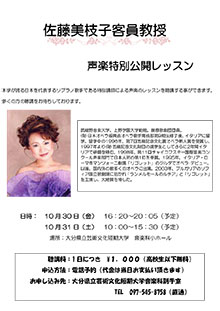 本学が誇る日本を代表するソプラノ歌手・佐藤美枝子客員教授による声楽のレッスンを10月30日(金)、31日(土)に開催します。レッスンは聴講する事ができます。多くの方の聴講をお待ちしております。