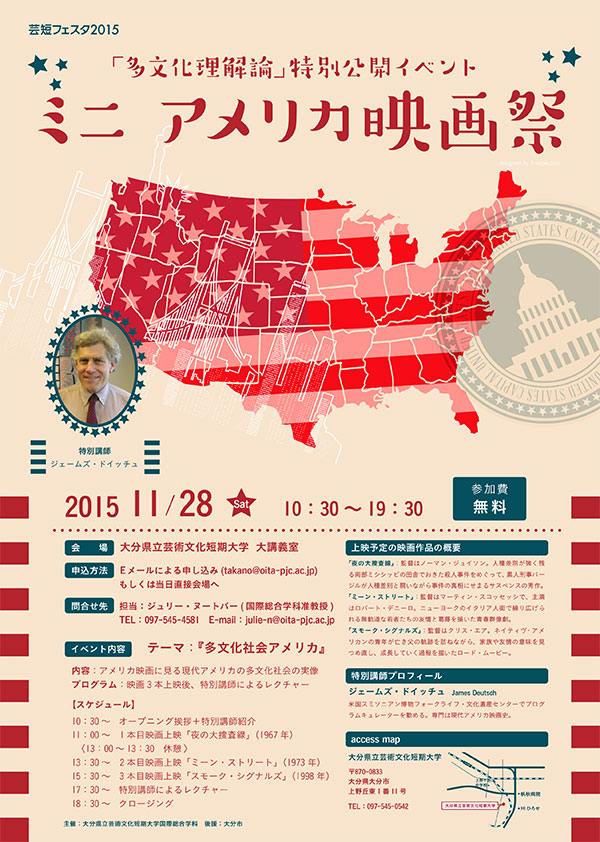 「多文化理解論」特別公開イベント「ミニ アメリカ映画祭」を11月28日(土)に本学で開催します。「多文化社会アメリカ」をテーマに、アメリカ映画に見る現代アメリカの多文化社会の実像を探るべく、映画3本の上映と特別講師によるレクチャーを行います。