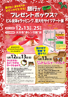大分中心市街地のクリスマスを彩る企画「巨大モザイクアート展」が12月13日(日)に開幕します。「届けたい、あなたへのメリークリスマス!」という思いから、銀行をプレゼントボックスに見立ててラッピングします。JR大分駅から展示を眺めるベストスポット(赤レンガ館前)まで、地元の幼稚園による色とりどりのガーランドで誘導しますので、ぜひお越しください。