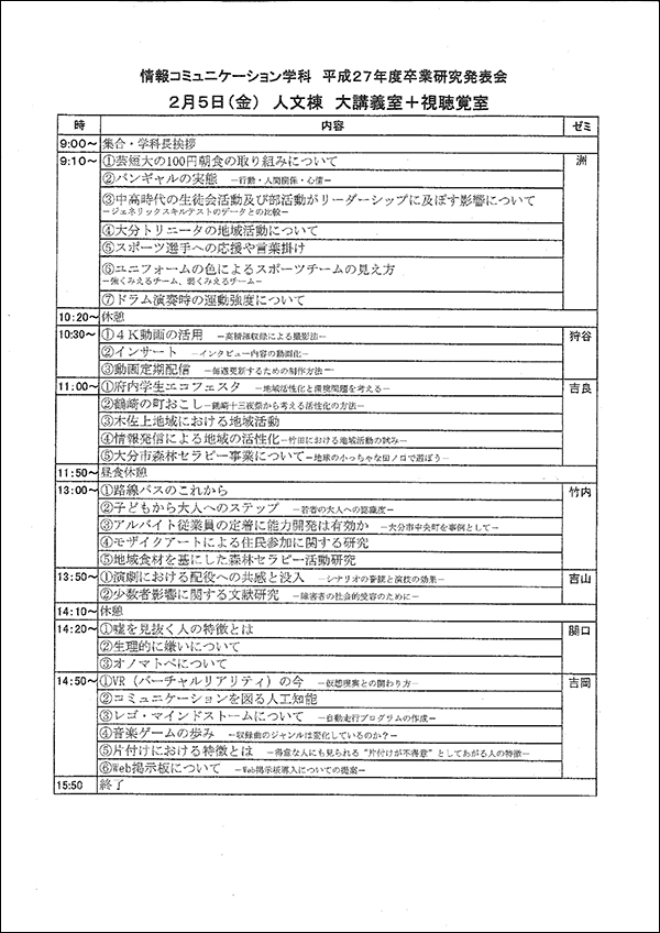 情報コミュニケーション学科の平成27年度卒業研究発表会を2月4日(木)、5日(金)に開催します。