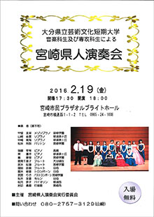 本学音楽科と専攻科の宮崎県出身の学生による「宮崎県人演奏会」を2月19日(金)、宮崎市民プラザオルブライトホールで開催します。声楽、ピアノ、管弦打それぞれの学生が日頃の成果を披露します。