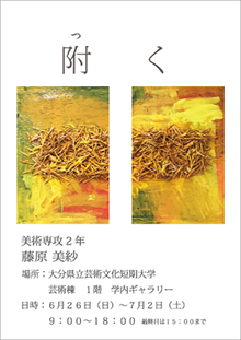 学内ギャラリー(芸術棟1階)では、6月26日(日)~ 7月2日(土)美術科美術専攻2年生:藤原 美紗さんによる作品展「附く」を開催します。