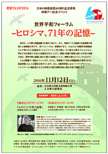 11月12日(土)本学人文棟大講義室において、世界平和フォーラム「ヒロシマ、71年の記憶」を開催します。