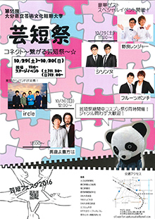 本学恒例の「芸短祭」を10月29日(土)、30日(日)に開催します。2日間にわたり、様々なステージイベントやサークル・ゼミによる出店、ワークショップ、展示などを行います。ゲストは野良レンジャーさん、シソンヌさん、フルーツポンチさん、馬鹿よ貴方はさんの4組の芸人と、ircleさんのバンドです。