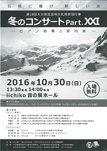 10月30日(日)、iichiko総合文化センター iichiko音の泉ホールにて開催される「第18回 大分県民芸術文化祭参加行事“白と黒 冬のコンサート Part.ⅩⅩⅠ ~ピアノ独奏と室内楽~」に、本学 釈迦郡誠名誉教授と、昨年専攻科音楽専攻を修了した今野俊郎さんらが出演します。