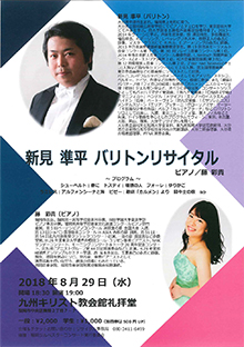8月29日(水)、九州キリスト教会館礼拝堂にて開催される「新見準平 バリトンリサイタル」に本学音楽科新見準平非常勤講師が出演します。皆さま、ぜひ足をお運びください。