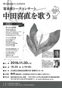11月30日(金)、本学 音楽科小ホールにて、宮本修トークコンサート「中田喜直を歌う」を開催します。本学名誉教授の宮本修と本学卒業生・演奏員の吉元優喜乃が出演します。ぜひ、足をお運びください。