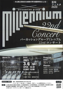 3月6日(土)、本学音楽ホール棟音楽ホールにて、本学音楽科打楽器専攻生による打楽器アンサンブルの演奏会「パーカッショングループミレニアム22ndコンサート」を開催します!