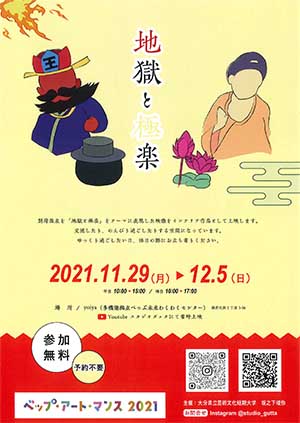 別府温泉を「地獄と極楽」をテーマに表現した映像をインテリア作品として上映します。交流したり、のんびり過ごしたりする空間になっています。ゆっくり過ごしたい日、休日の際にお立ち寄りください。