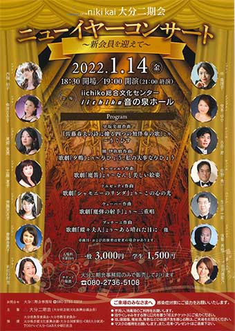 2022年1月14日(金)、iichiko総合文化センターiichiko音の泉ホールにて、大分二期会「ニューイヤーコンサート~新会員を迎えて~」を開催されます。