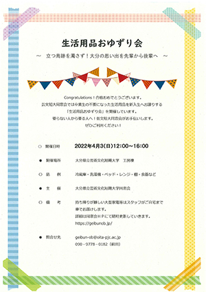 【新入生・在学生の皆さまへ】生活用品おゆずり会を開催します