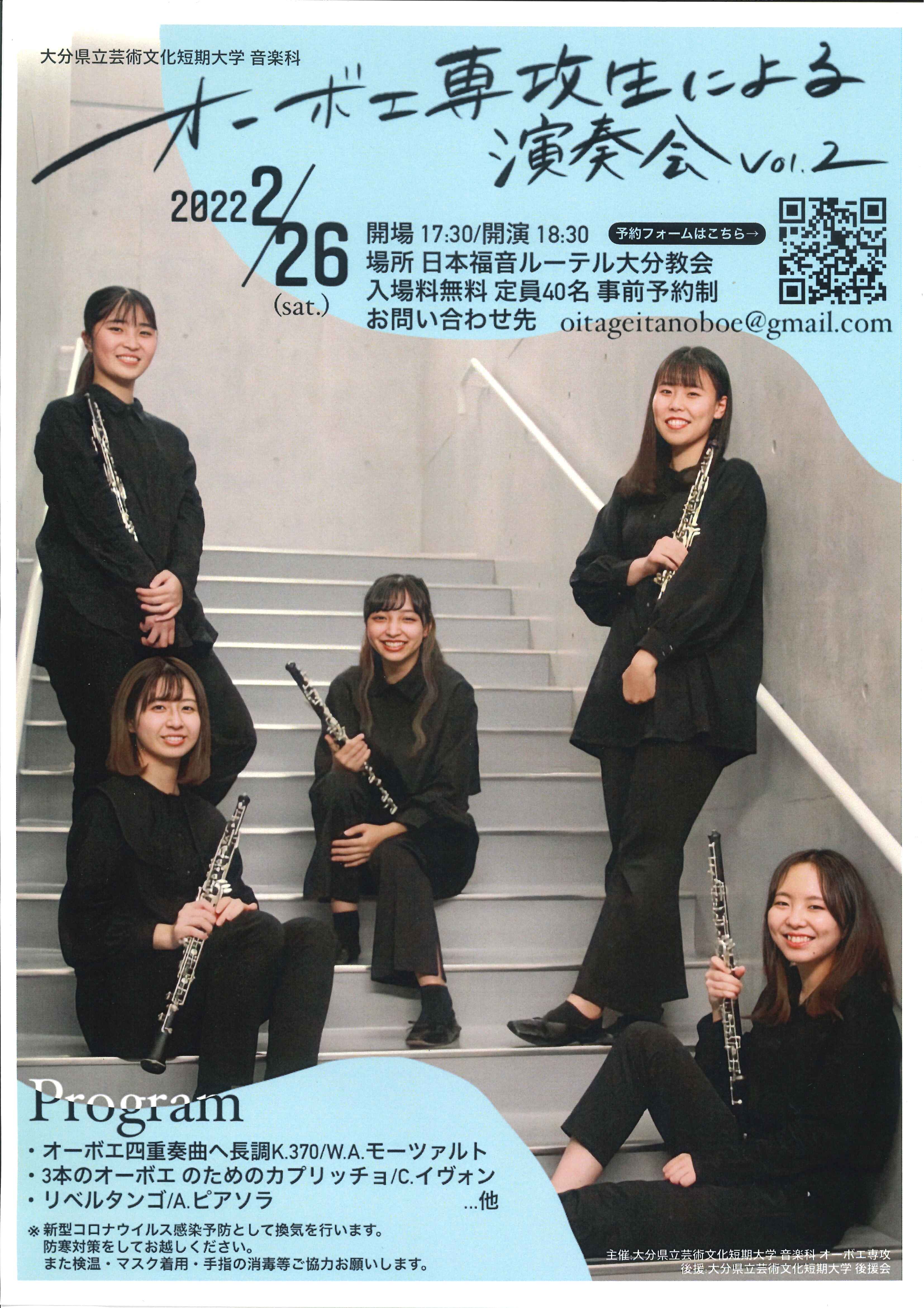 2月26日(土)に、日本福音ルーテル大分協会にて本学音楽科「オーボエ専攻生による演奏会vol.2」を開催します。