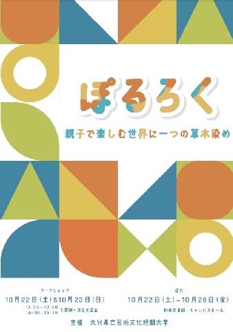 10月22日(土)、23日(日)芸短祭の日程に合わせて、本学染色実習室にて親子で楽しむ草木染めワークショップを開催します。合わせて、10月22日(土)から28日(金)まで、大分県立芸術文化短期大学 キャンパスモールと図書館にて、展示会を開催します。
