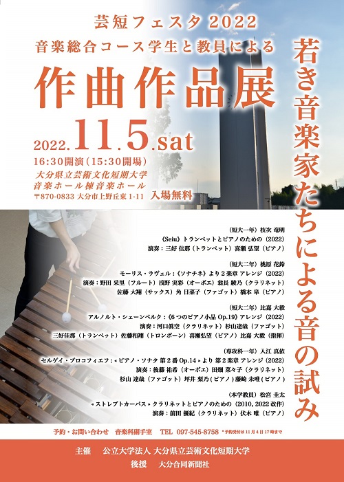 - 予約受付あり、11月4日17時まで▷▷音楽科副手室(TEL:097-545-8758)