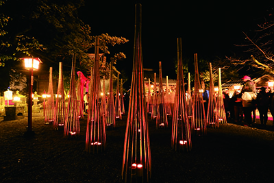 臼杵市で開催される「うすき竹宵」に毎年参加しています。企画から製作、設置、運営まで学生が主体となって臼杵八坂神社の境内に“竹ぼんぼり”による巨大な造形作品を出現させました。