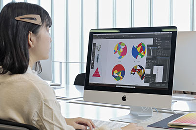 ビジュアルデザインコースを選択する学生は、基礎表現とパソコン実習によるアプリケーション操作を習得したうえで、実践的な課題制作に取り組みます。課題は広告ポスター・パッケージデザイン・ブランディング・イラストレーション・webサイト制作等を行い、ソフトを組み合わせて多様な表現ができるように指導しています。コミュニケーション力とプレゼンテーション力を養い、実社会で新しい価値を提案できる創造力のあるクリエーター育成を目標としています。