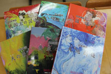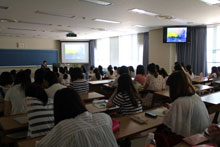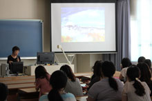 授業では、マークエステル画伯が描いた古事記の絵をスクリーンに映し出しながら、森さんがそのストーリーを読み語りました。“古事記”というと少し難しいイメージがありますが、マークエステル画伯の美しい絵と、心地よい音楽にのせた森さんの語りは、“目と耳で古事記を感じる”ことができ、学生たちも古事記の世界に飲み込まれているようでした。