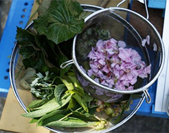 学生たちは森の清掃などを行い、野草の天ぷらをごちそうになりました。