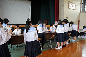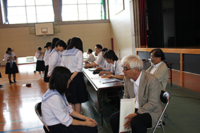 音楽科は平成30年度から大きく変わる、音楽総合コースの新設と、入試日程の変更について清水万敬教授と森口真司教授から説明がありました。美術科は各コースの特長を、学生たちの作品や活動の様子をスライドで紹介しました。高校生は実際の作品を、興味深そうに見てくれました。