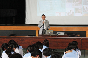 まず体育館での全体説明会で、教務学生部の洲部長から本学の概要の説明があり、国際総合学科、情報コミュニケーション学科を含む全学科の説明をしました。