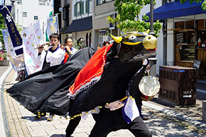 イベントは13時に府内丑舞の方の協力のもと、オープニングパレードでスタートしました。府内丑舞は西新町天満社に伝わる丑舞をもとに、中心市街地の活性化を目的として県立美術館開館を契機にはじまったプロジェクトです。