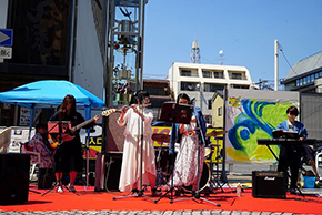 同じく13時から、五番街の中心にある時計台で、本学のジャズサークル・軽音サークル・ダンスサークルなどによるステージと、美術科学生によるライブペイントを行いました。