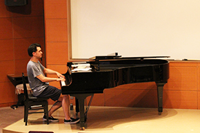 大講義室には大学内外から約70名の参加者が集まり、渡邊氏のピアノ演奏ではじまりました。