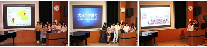 芸文短大は3つのグループに分かれ、それぞれ「大分県」「大分市」「芸文短大」をテーマに、自分たちがどんな街のどんな大学で、どんな勉強をしているのか、韓国語でスライドにまとめ、紹介しました。