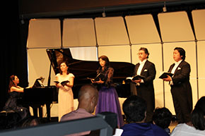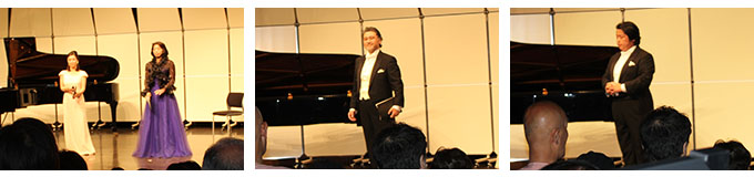 コンサートはまず行天准教授と新見非常勤講師による「箱根八里」のアカペラではじまり、次に愛甲教授と林専任講師による組歌「四季」より「花」が披露されました。組歌「四季」より「納涼」「月」「雪」と続き、情感豊かな歌声と美しい日本の四季に、会場の多くの人々は思いを馳せました。