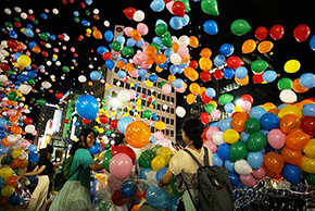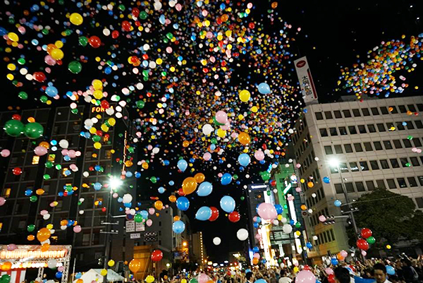 今年は参加者に太鼓を配り、太鼓のリズムとともに風船をリリース。夏の夜空に放たれた風船は鮮やかで、祭の熱気を一層盛り上げました。