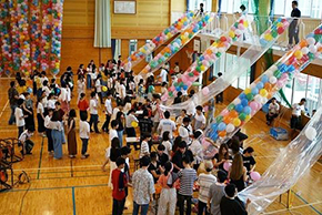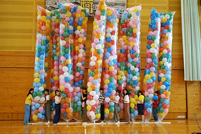 学生たちは当日の午後2時から荷揚小学校体育館に集合し、バルーン作りを行いました。約2万個のバルーン完成後は七夕まつりの会場に移動し、市民のみなさんに風船を配りました。