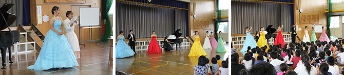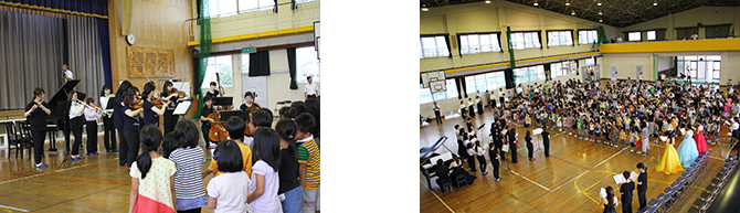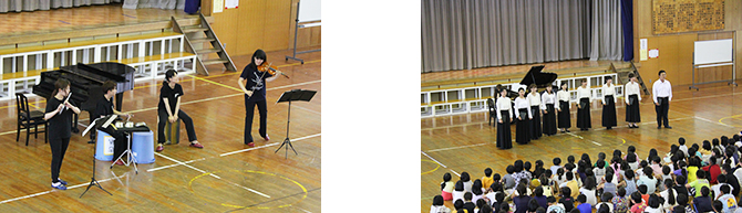 9月11日(月)、宇佐市立四日市北小学校で地域巡回演奏会を開催しました。本学音楽科学生34名が全校児童、教員、地域の方々約330名を前に、オペラハイライト、ピアノソロ・連弾、弦楽アンサンブル、トランペット5重奏、器楽アンサンブル、合唱を披露しました。
